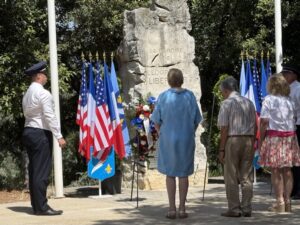 La Présidente Professeur Martine Raphaël, le Président d’Honneur et les membres présents du bureau rendent Hommage au valeureux équipage à la Croix des Gardes en déposant une gerbe lors de la cérémonie. Madame le Consul des États-Unis d’Amérique était présente. Le crash du B-24 Libérator de l’ USAAF surnommé » Stricly from Hunger » abattu par la flack allemande.